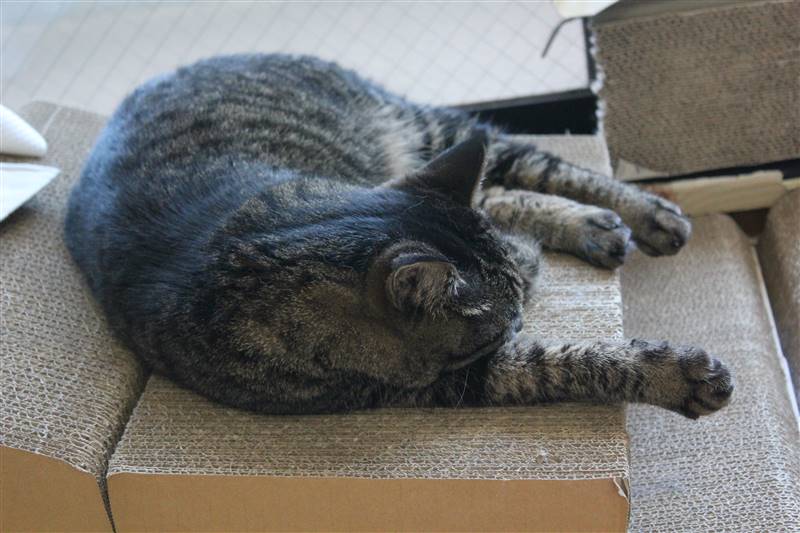 そして気が付いた時には、みかちゃんの爪とぎ段ボールには粉がびっちり。あわててはらったのですが肉球についたのがとれません。