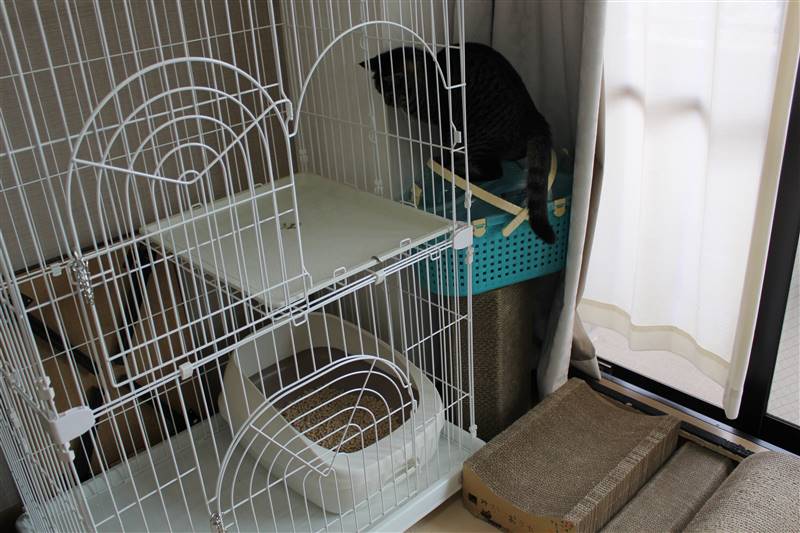 ケージにいれるとかわいそうという気持ちになる人もいるでしょうが いないときに何があるかわからないから安全の為になれさせておく と思っています。