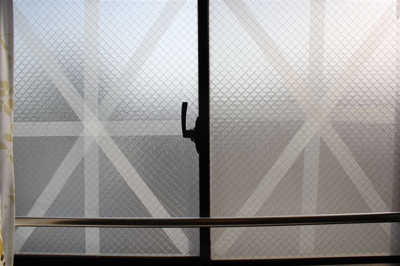 台風の時は網入りの窓ガラスでも割れると飛散するため養生テープを使用